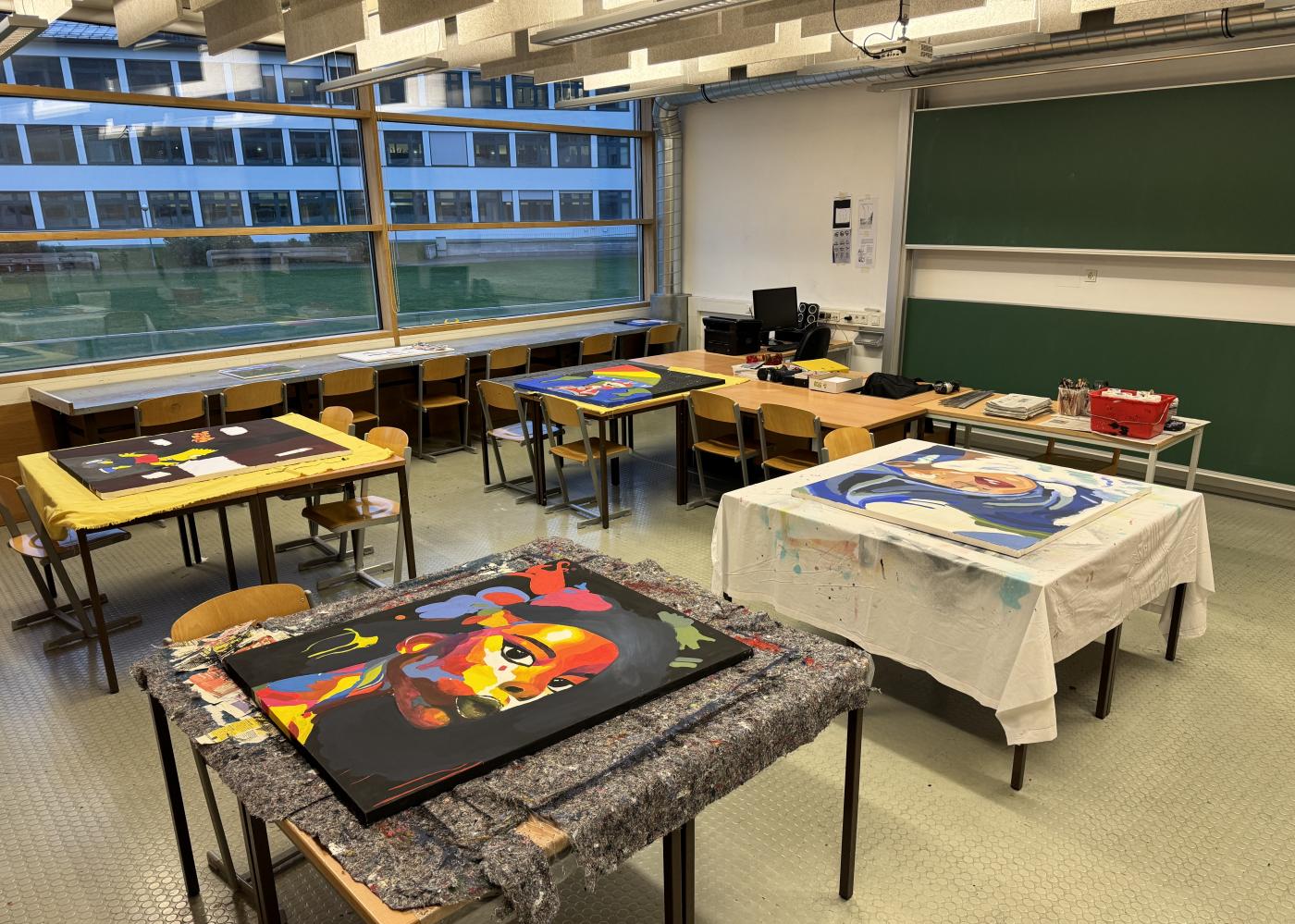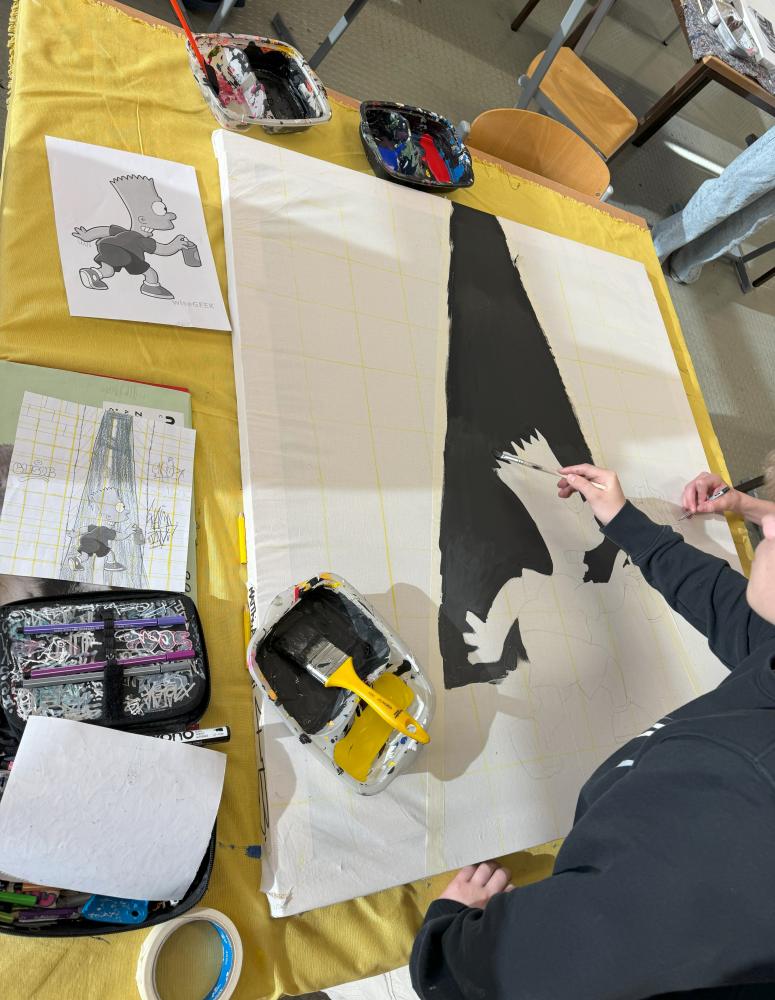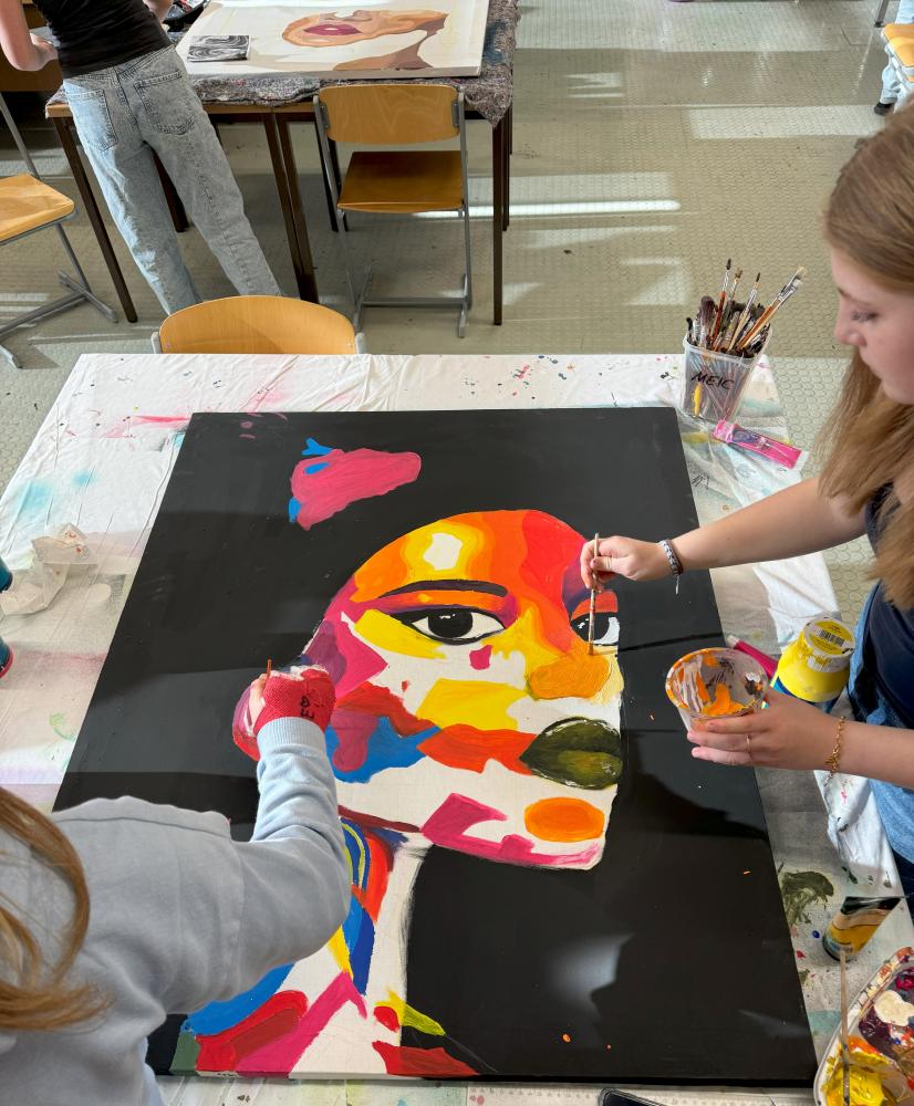 Ob als Einzel-, Partner:inarbeit oder im Dreierteam, ob im kleinen oder großen Rahmen – die künstlerischen Arbeiten zeigen die vielfältigen Gestaltungsmöglichkeiten der Acrylmalerei.