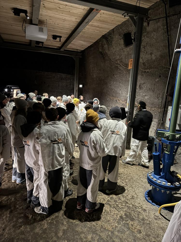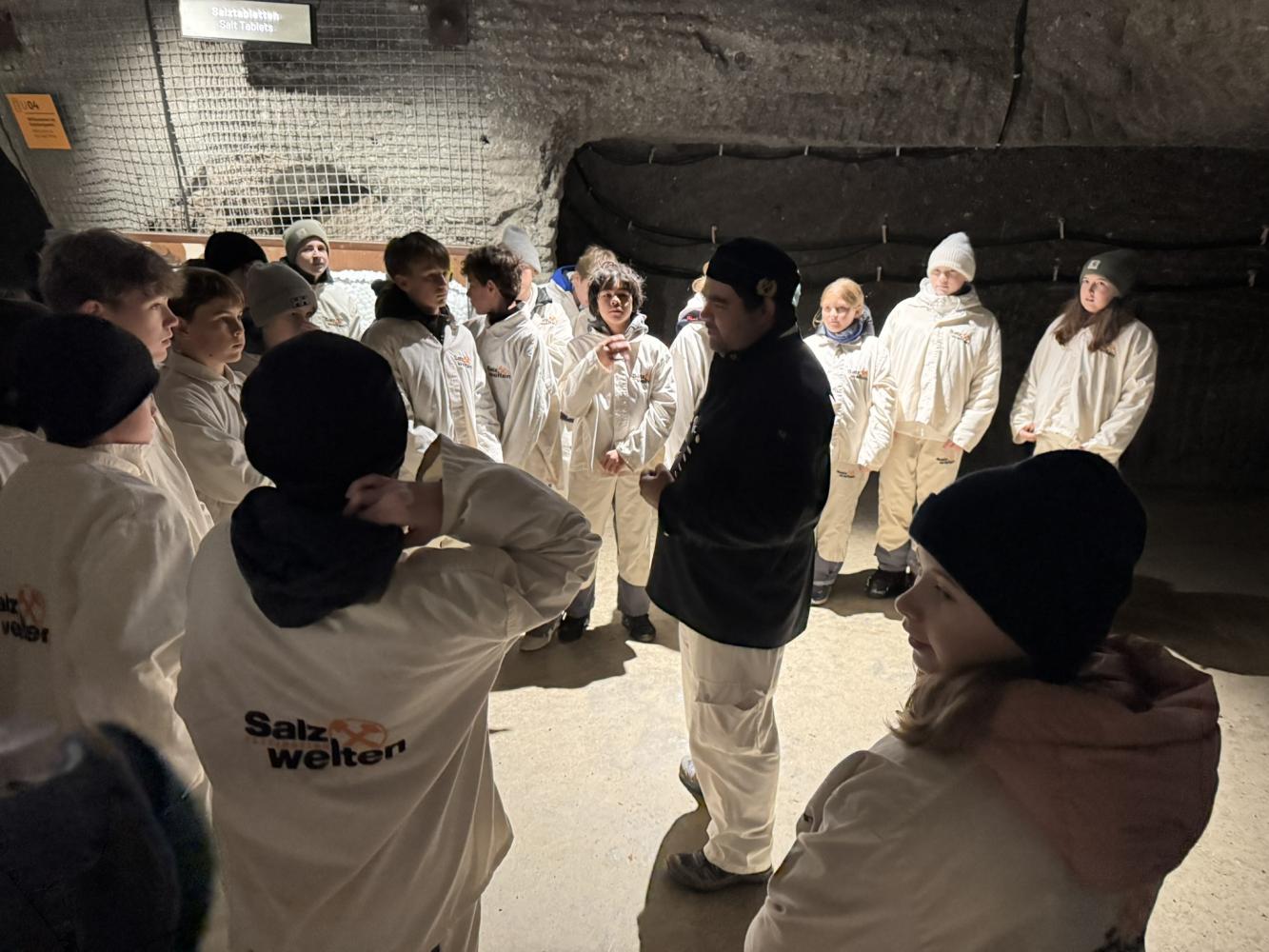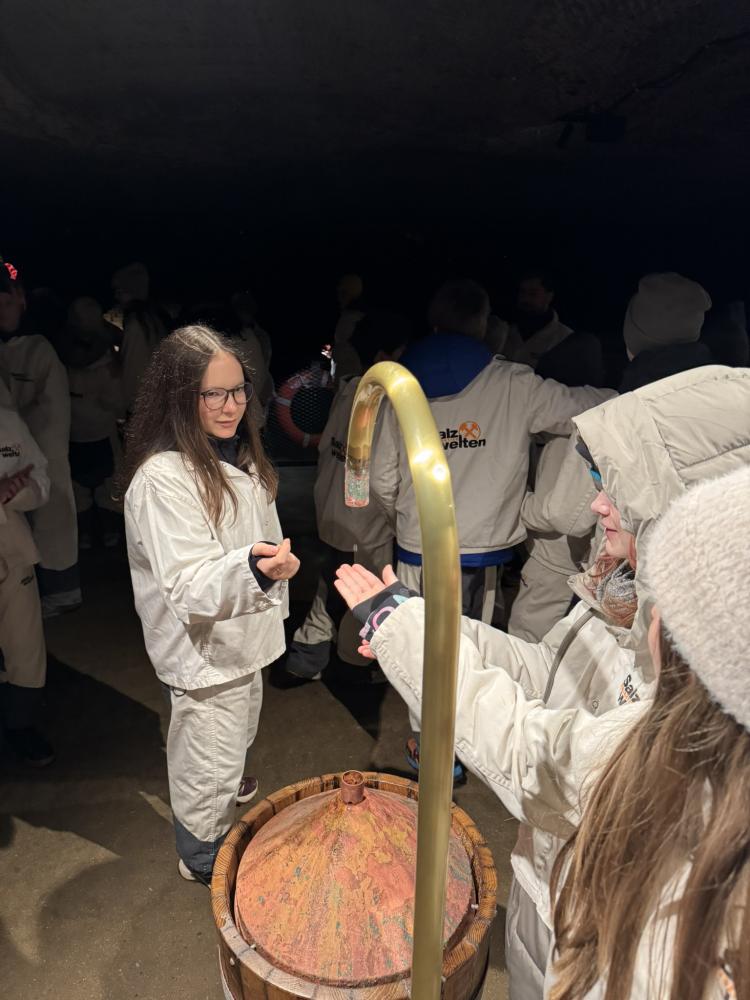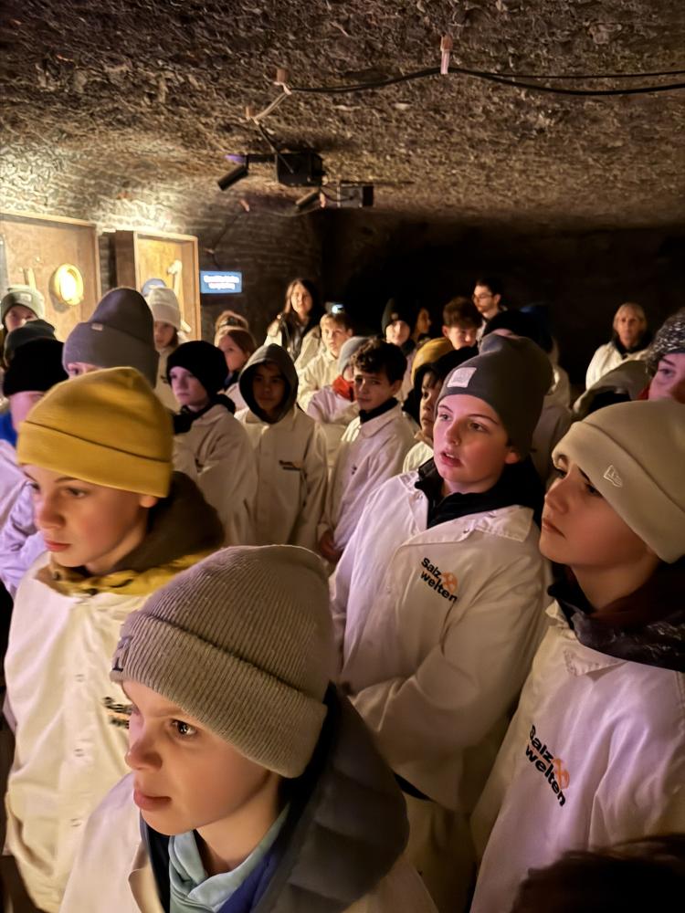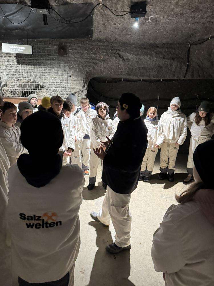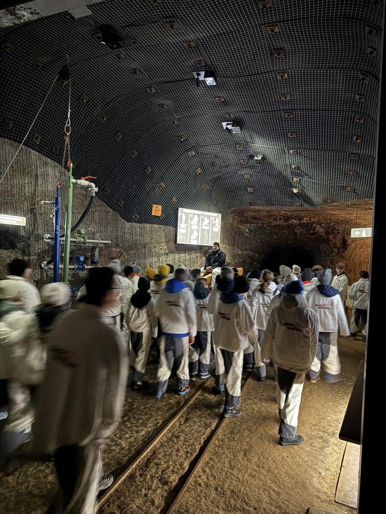 Als unsere Führung schließlich begann, haben wir uns einen kurzen Einführungsfilm angeschaut. Danach wurde es spannend: Wir bekamen alle eine spezielle Schutzkleidung, dann fuhren wir mit einer Art Zug in das Salzbergwerk hinein, allein das war schon ein tolles Erlebnis!