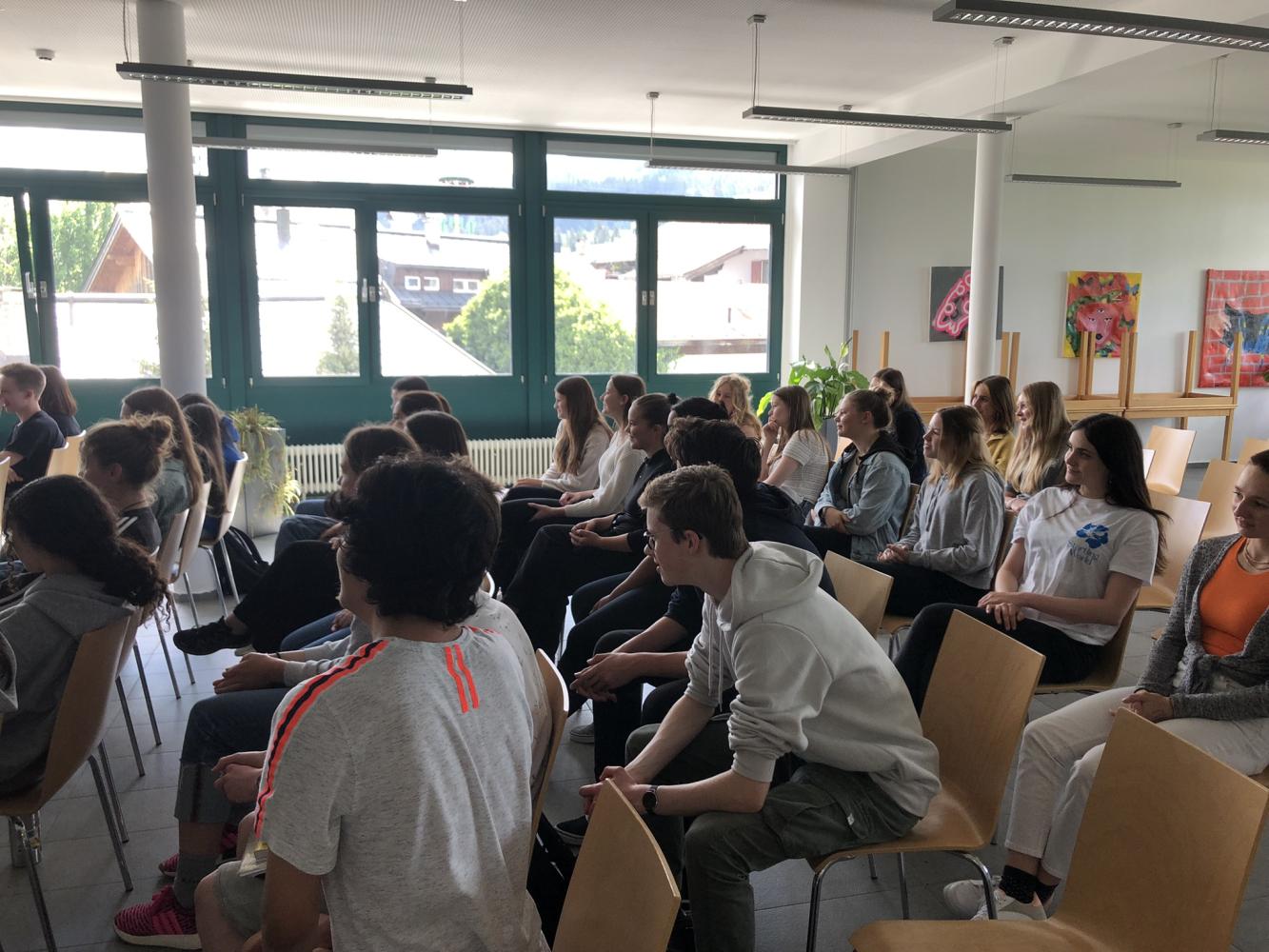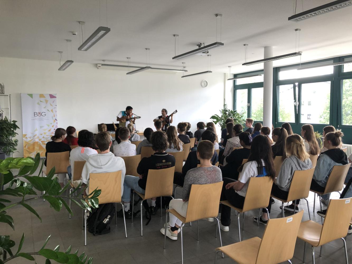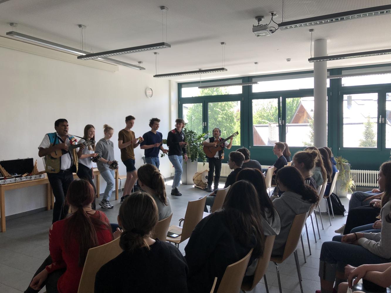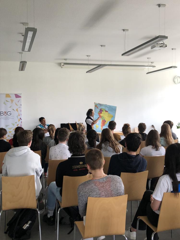 Mit Unterstützung durch den Tiroler Kulturservice hatten die 6. Klassen die Möglichkeit eine Stunde etwas über lateinamerikanische Musik zu erfahren. Die zwei Musiker aus Peru spielten und sangen traditionelle Musik aus ihrer Heimat, die die meisten nur schwer auf ihren Stühlen sitzen ließ. So kamen auch alle sofort den Aufforderungen nach, wenn Mitklatschen oder Mitsprechen gefragt waren. Zusätzlich erfuhren die Schüler/innen Einiges über das Herkunftsland der Musiker und die typischen Instrumente, z.B. die Siku (eine Art Panflöte aus den Anden). Das Duo zeigte, dass man mit der Quena (eine Holzflöte) sogar österreichische Volksmusik spielen kann. Mit dem Hit Despacito verabschiedeten sie sich begleitet von großem Applaus.