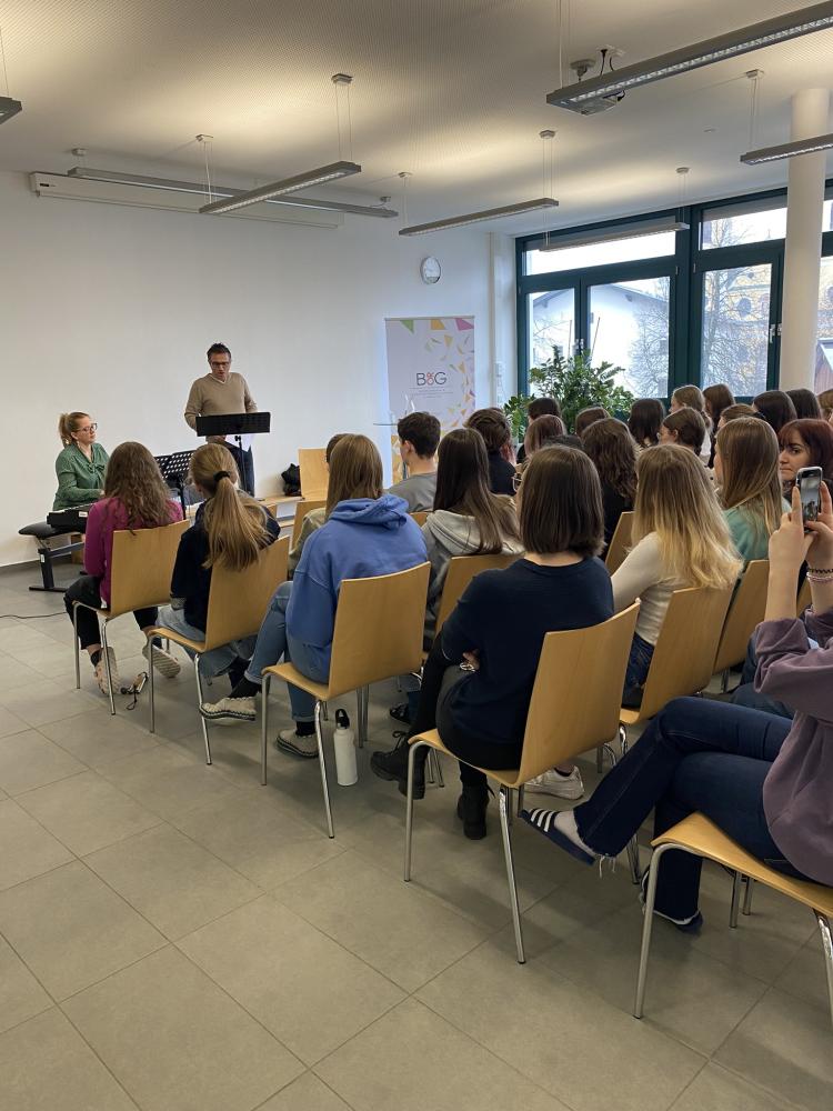 Der Sänger gab gemeinsam mit seiner Frau, die ihn am Klavier begleitete, einen musikalischen Überblick über die verschiedenen Epochen und Stile, wobei zwischendurch immer wieder Anekdoten aus der Zeit der Kastraten erzählt wurden. Besonders interessiert waren die SchülerInnen, als der Künstler von seiner Ausbildung und dem Berufsleben als Sänger erzählte. Am besten kam die lockere Art der beiden Musiker an, die mit Schmäh und Charme das Thema vermittelten.
