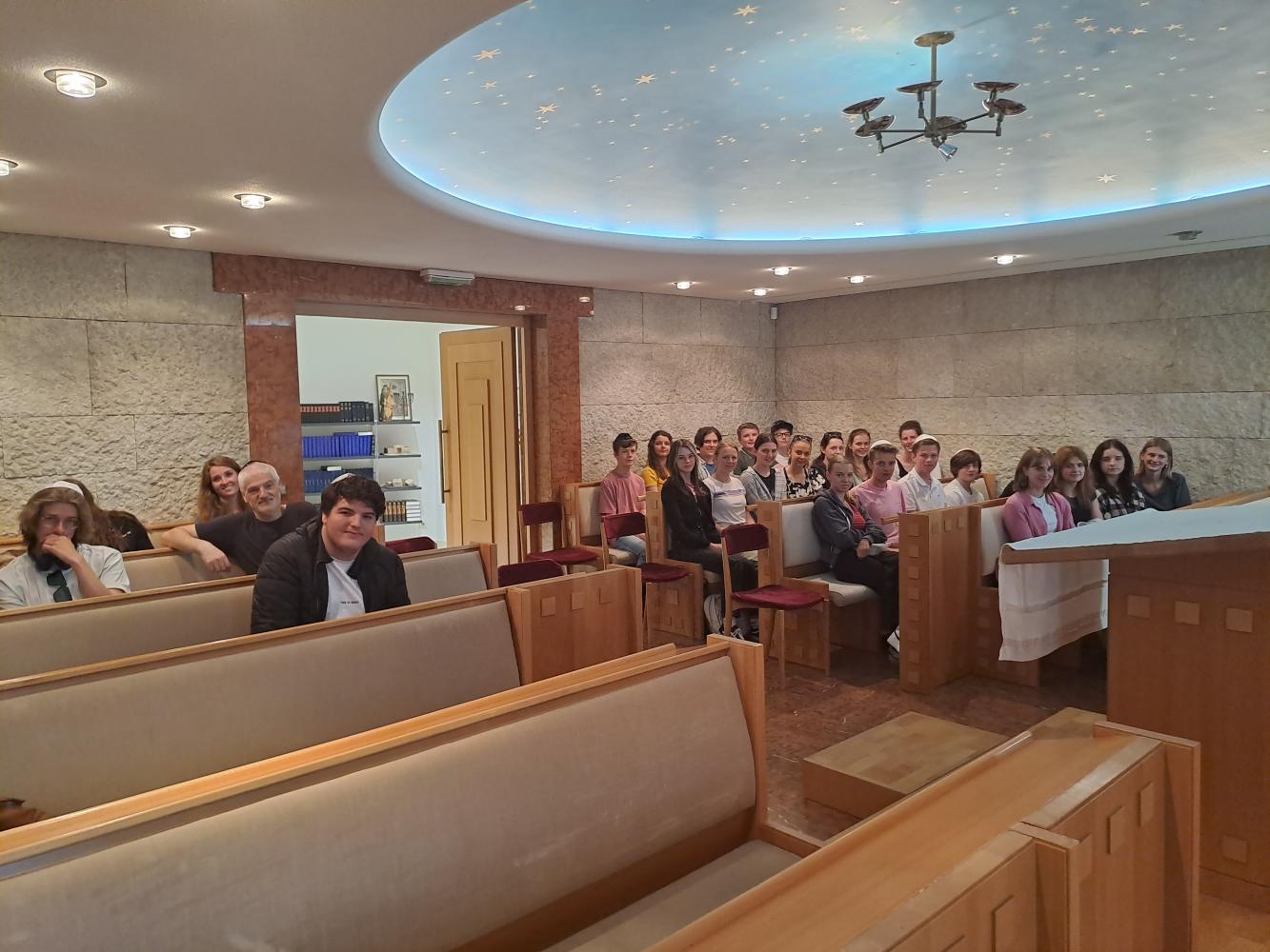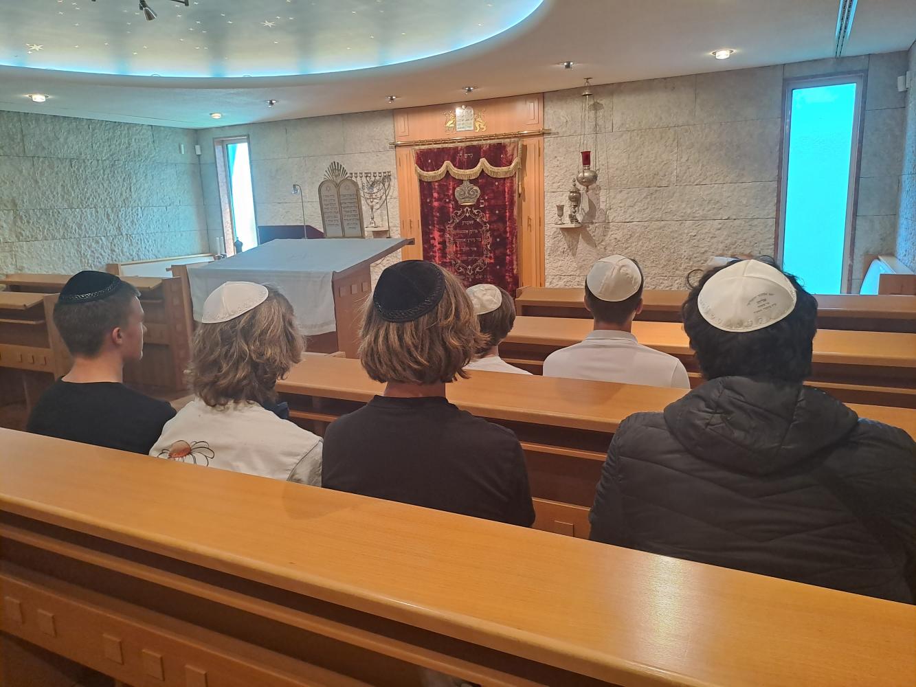 In der Synagoge angekommen erhielten die Schüler:innen einen umfangreichen Einblick in die Bräuche, Traditionen und Schriften des Judentums. Die männlichen Schüler wurden darum gebeten, vor dem Betreten des heiligen Raumes, eine Kippa (=Kopfbedeckung) aufzusetzen. Im Zuge der Besichtigung konnte die Gruppe die wichtigsten Gegenstände der Synagoge bewundern und deren Bedeutung wurde näher erklärt. Außerdem wurden die Gemeinsamkeiten und Unterschiede zwischen Judentum, Christentum und Islam erläutert, wobei interessante Fakten ans Licht kamen.