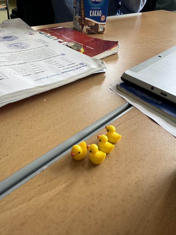 In jeder noch so kleinen Ritze finden sich seit heute kleine gelbe Plastikenten. Ihr Zweck ist noch nicht bekannt, die Gerüchte laufen heiß (ob wohl die 8. Klassen oder doch die Tourismusschüler:innen dahinterstecken?) aber die Schatzsuche ist in vollem Gange.