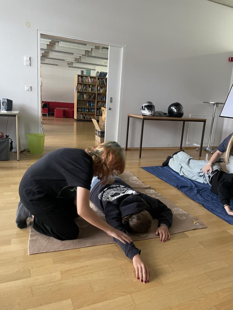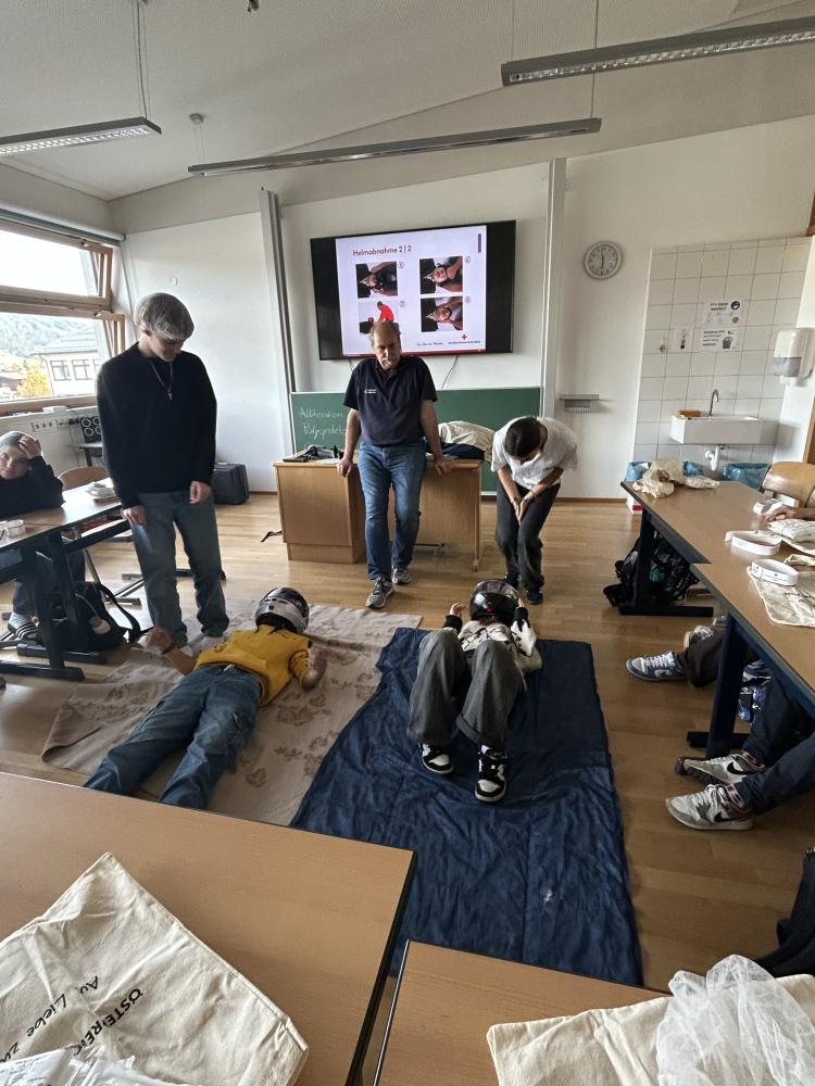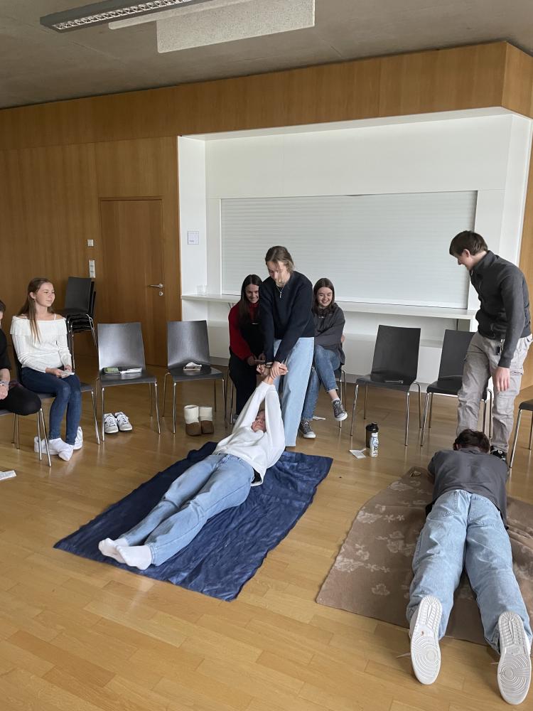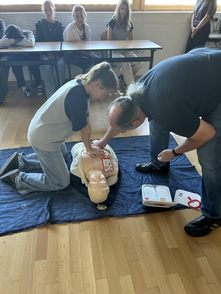 Was tun, wenn jemand plötzlich bewusstlos wird, allergisch auf einen Wespenstich reagiert oder gar einen Herzinfarkt erleidet? 31 Schülerinnen und Schüler aus den 5. und 6. Klassen nahmen von September bis Oktober an den 16stündigen Erste Hilfe Kursen teil und durften noch vor den Herbstferien ihre Ausweise in Empfang nehmen. Neben der eher trockenen Theorie gab es während der Kursnachmittage auch immer genügend Zeit um das neu Gelernte in der Praxis auszuprobieren. Die Teilnehmerinnen und Teilnehmer legten sich gegenseitig Verbände an, brachten sich in die stabile Seitenlage, retteten sich vor dem Ersticken oder erprobten die Anwendung eines Epipens. An Reanimationspuppen wurde nicht nur die Herzdruckmassage geübt, sondern auch die richtige Anwendung eines Defibrillators.