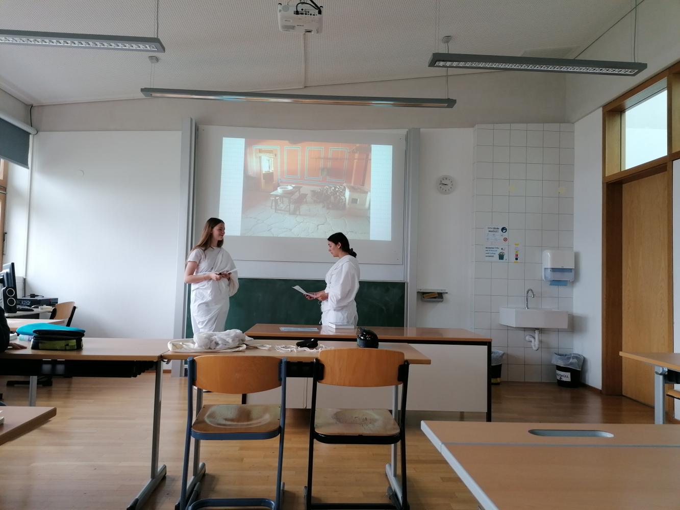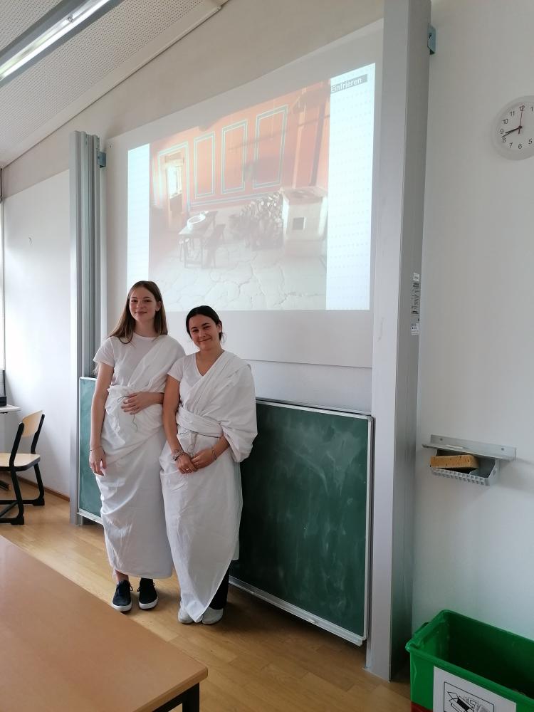„Latein ist so langweilig, wir übersetzen immer nur trockene Texte von Cicero und Cäsar.“ – Von wegen! Anfang Mai standen die Lateinstunden der Kurzlateiner aus der 7a unter dem Motto: „Gelebte Lateinstunden: Latein im Alltag“. Wir setzten uns mit spannenden Dingen zum Leben der antiken Römer auseinander und stellten Fragen, wie z.B.: Wie wohnten die Römer? Was aßen sie? Wie erging es den Sklaven? Woher kam eigentlich das ganze Wasser? … und noch viele mehr. Wir recherchierten, lasen und probten für die anschließenden Präsentationen. Im Zuge einer solchen Präsentation konnten wir es uns natürlich nicht verkneifen uns ordentlich in Schale zu werfen – oder besser gesagt: in die Toga!