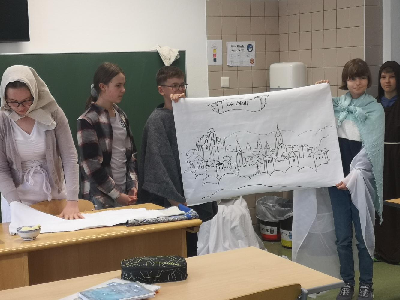 Wir waren alle gelangweilt in unserem Klassenzimmer, als unsere Geschichtelehrerin den Raum betrat und verkündete, dass wir ein Theater zum Thema „Leben im Mittelalter“ machen werden. Also wurden wir in Gruppen aufgeteilt und hatten etwa drei Wochen Zeit, um ein Stück zu schreiben und alles zu lernen.
