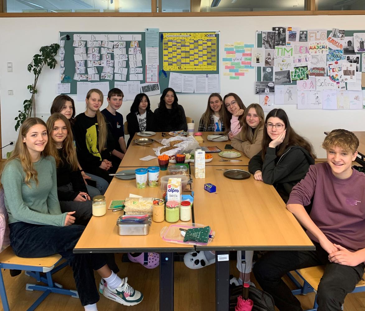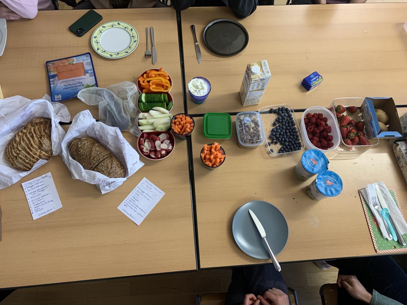 Was könnte besser als Abschluss des Themas „Ernährung“ passen, als die Theorie in die Praxis umzusetzen und ein möglichst gesundes Frühstück zusammenzustellen? Auch die SchülerInnen waren leicht dafür zu begeistern und so organisierten die 5a eine ausgewogene Mahlzeit zum Start in den Schultag. Es gab neben ballaststoffreichem Vollkornbrot voller komplexer Kohlenhydrate auch proteinreiche Zutaten mit hoher biologischer Wertigkeit, ungesättigte Fettsäuren von Avocados und Nüssen und natürlich viele Vitamine und Mineralstoffe in Gemüsesticks und Beeren.