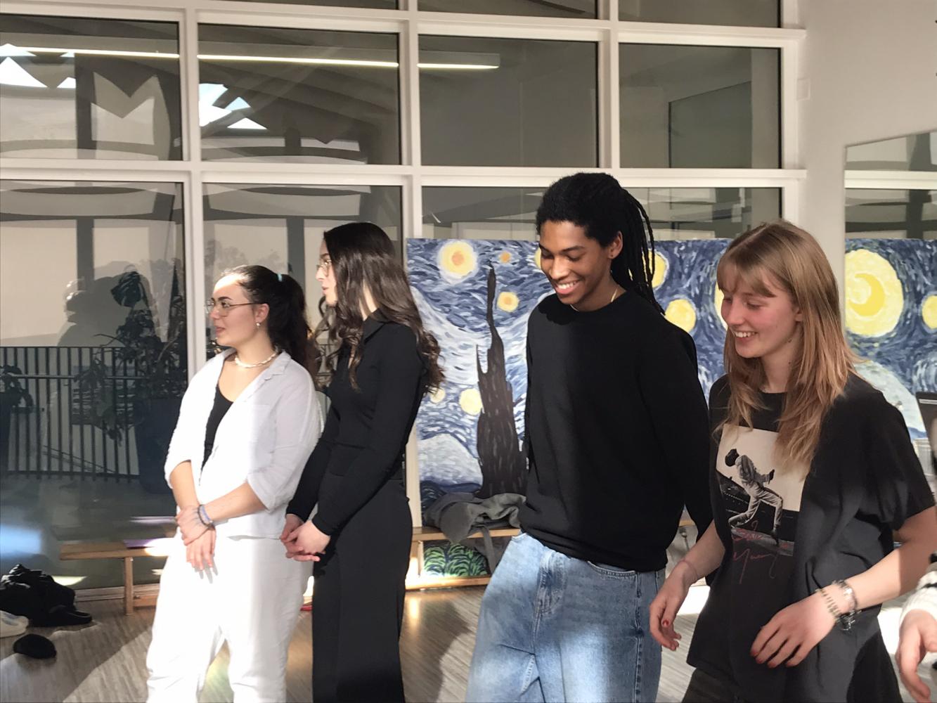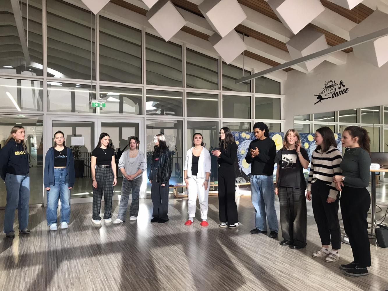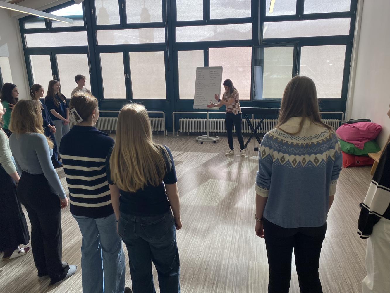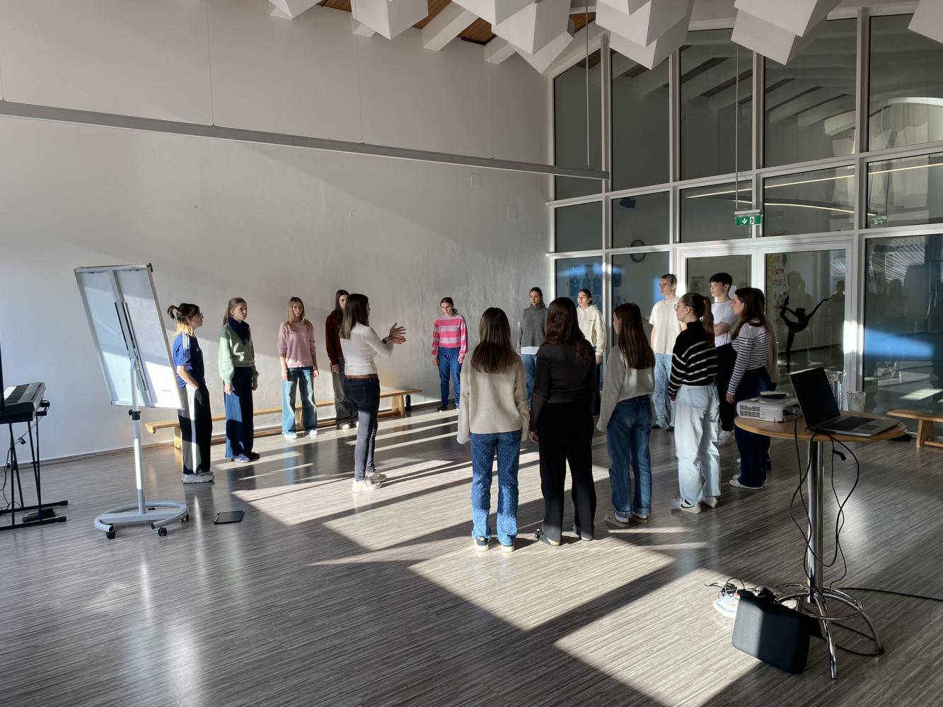 Die Schüler*innen der Musikklassen entdeckten in der Woche vor den Semesterferien in 90-minütigen Workshops zum Thema „Vocal Painting“ ihr eigenes kreatives Potenzial beim Komponieren von Musikstücken. Durch bestimmte Handzeichen geben die Chorleiter*innen einzelnen Chorteilnehmer*innen vor, welche musikalischen Bausteine (Vokal, Bodypercussion) sie erfinden sollen. So entsteht zusammen ein Stück, ohne Noten, alles live in diesem Moment auf der Bühne. Diese Methode basiert auf sogenannten Loops, also kurzen Abschnitten (Rhythmus oder Melodie), die immer wiederholt werden.