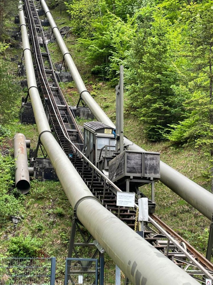 Vor dem Kraftwerk stand ein Lift aus den 1960ern der Mithilfe von Schienen zum Speichersee fährt. Man könnte aber auch die mehr als 3800 Stufen nutzen, um zum Speichersee zu gelangen. Diese Stufen wurden bisher in einer Rekordzeit von rund 30 min bewältigt. Leider durften wir den Lift und die Treppen nicht nutzen.
