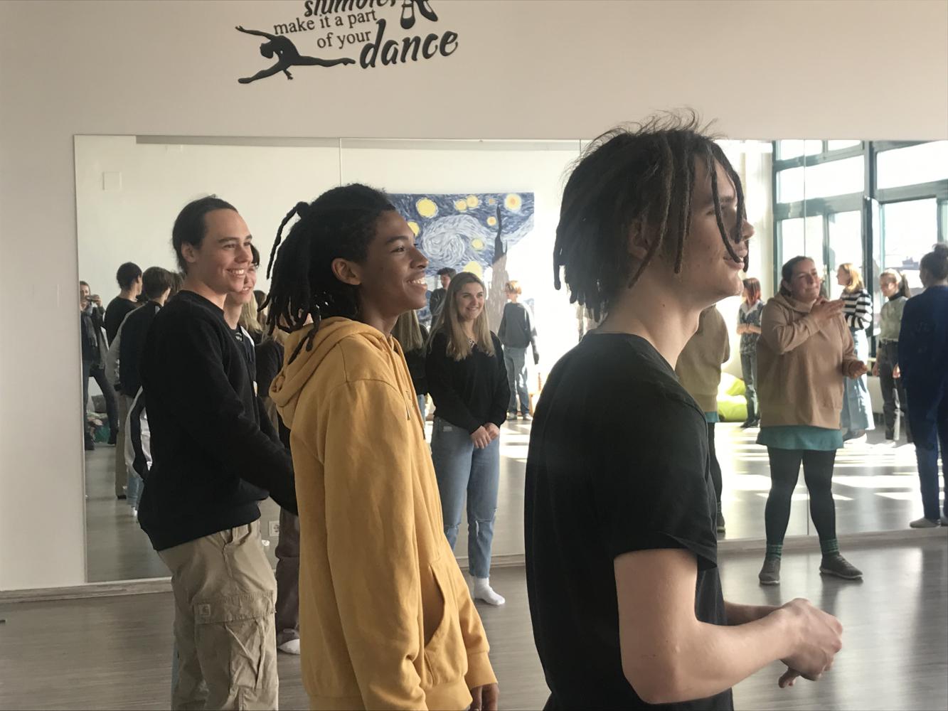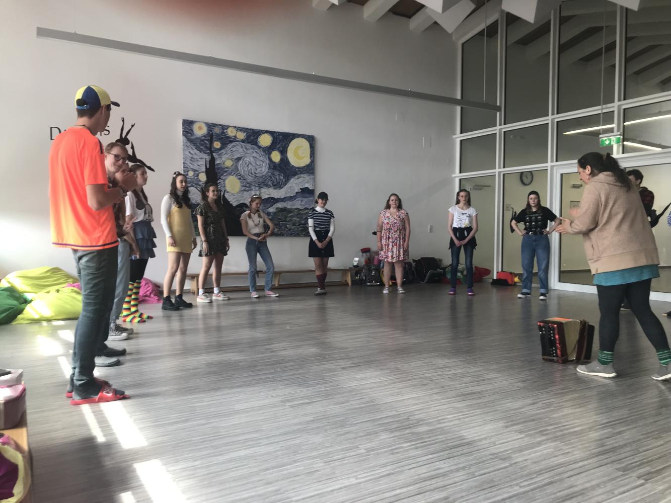 Angefangen haben wir mit ein paar Aufwärm-Übungen. Dazu gehörten eine kurze Beatboxing-Session mit wiederholten „P-tz-Bsch-tz" Lauten, Übungen, um verschiedene Töne im Kopf- und Brustregister zu singen und auch Tierlaute, bei denen man von einem tiefen Ton aus mit schnellen Wechsel in die Kopfstimme zu einem sehr hohen Ton gelangen konnte – genau auf das kommt es beim Jodeln nämlich an. Viele von uns fanden diese Übungen sehr amüsant, sie waren aber auch spannend und hilfreich für den nächsten Teil.