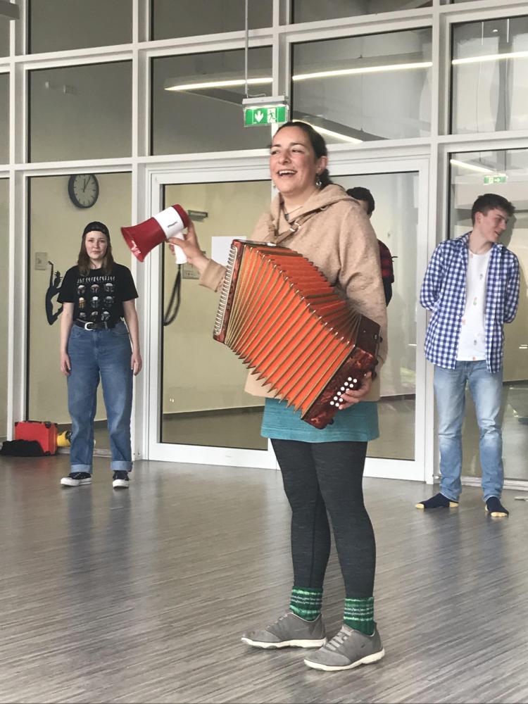 Die Musikklassen versammelten sich für jeweils eine Schulstunde in der Tanzaula. Nach einer kurzen Vorstellung der „Jodel-Lehrerin“ ging es aus schon los.
