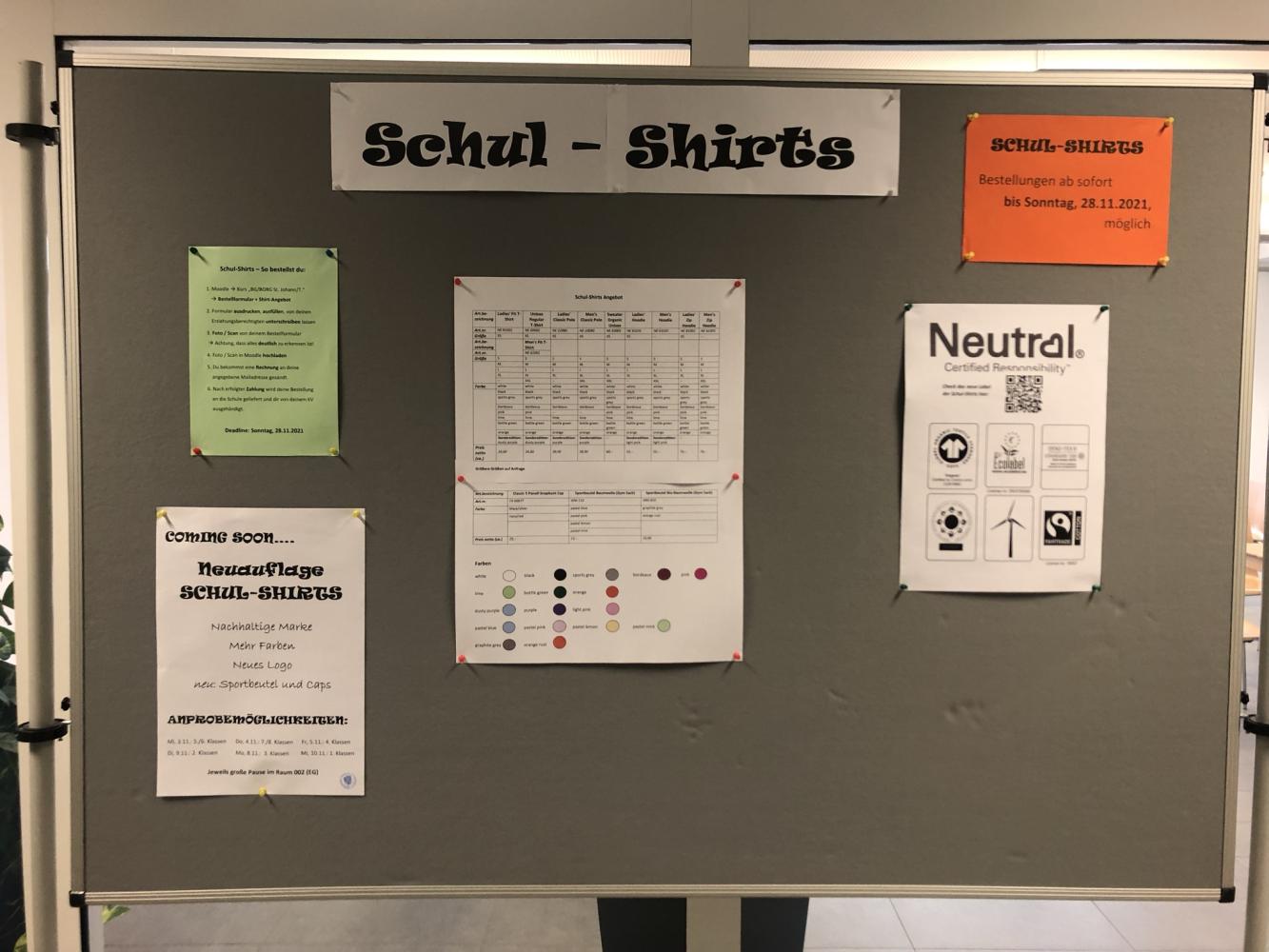 Die Shirts präsentieren sich heuer in einem neuen Design und es kann aus mehr Farben ausgewählt werden. Das komplette Angebot kann vor der Aula oder auf Moodle besichtigt werden. Die neue Textilmarke Neutral steht für nachhaltige und ökologisch produzierte Kleidung. Außerdem gibt es zusätzlich zu T-Shirt, Polo, Sweater, Hoodie und Jacke dieses Mal Sportbeutel aus Baumwolle oder Bio-Baumwolle und Snapback Caps mit gesticktem Schullogo zu erwerben.