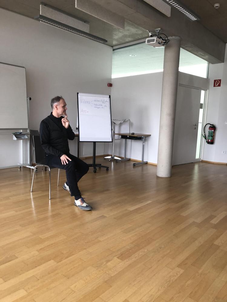 Für viele Schüler*innen ist die sogenannte VWA, die vorwissenschaftliche Arbeit, unbekanntes Terrain und daher mit Aufregung und Nervosität verbunden. Genau mit dieser Herausforderung möchte das Gymnasium die Schüler*innen der Oberstufe nicht alleinlassen. Ein wichtiger Baustein in dieser Begleitung sind die Workshops mit Thomas Lackner, der u.a. als Schauspieler am Tiroler Landestheater und in vielen ORF-Produktionen sowie als Moderator des Radiosenders Ö1 tätig ist. Seit fast zehn Jahren unterstützt sein Workshop „Ihr Auftritt, bitte! Stimme, Sprechen und Präsenz“ jedes Jahr die Abschlussklassen dabei, Prüfungsangst vorzubeugen und souverän Leistung bringen zu können. Finanziell unterstützt wird das Projekt durch den Elternverein der Schule. Auch die Lehrpersonen wurden in der Vergangenheit mehrfach von Thomas Lackner trainiert.