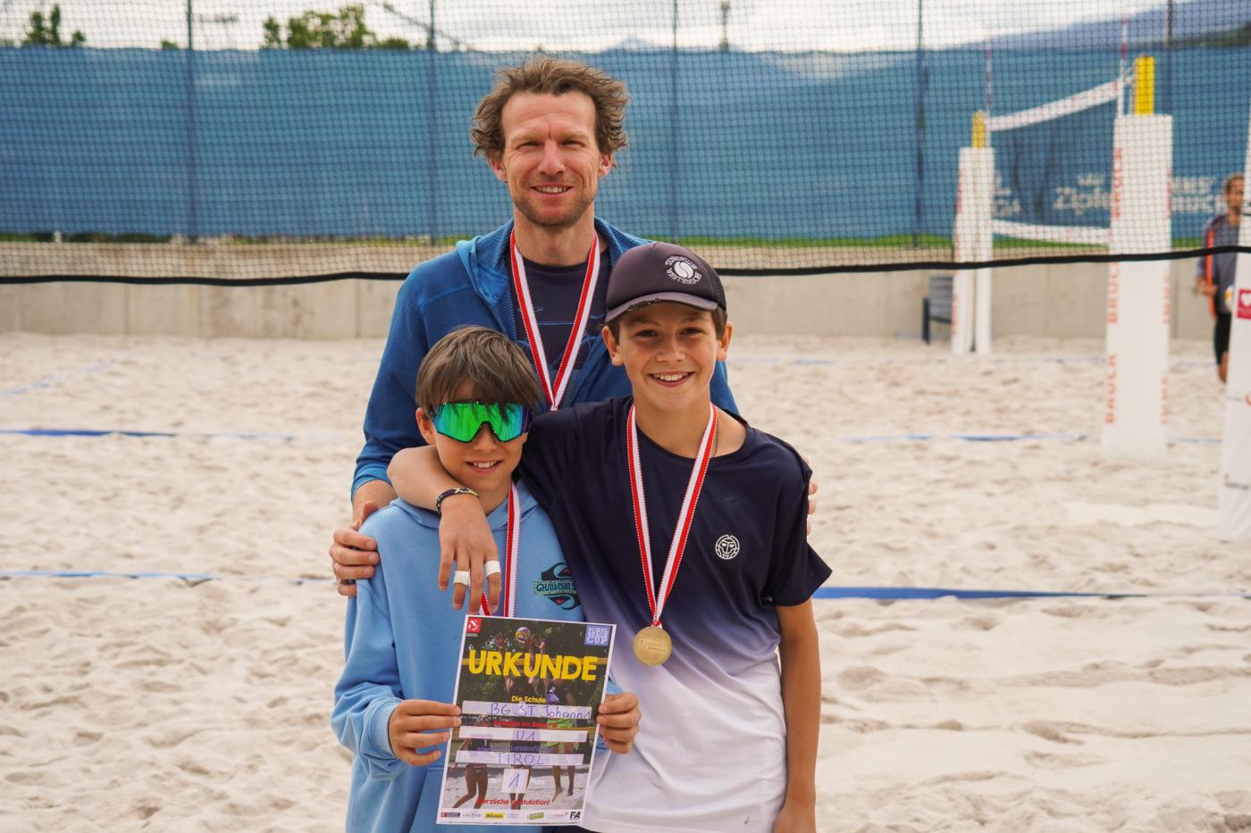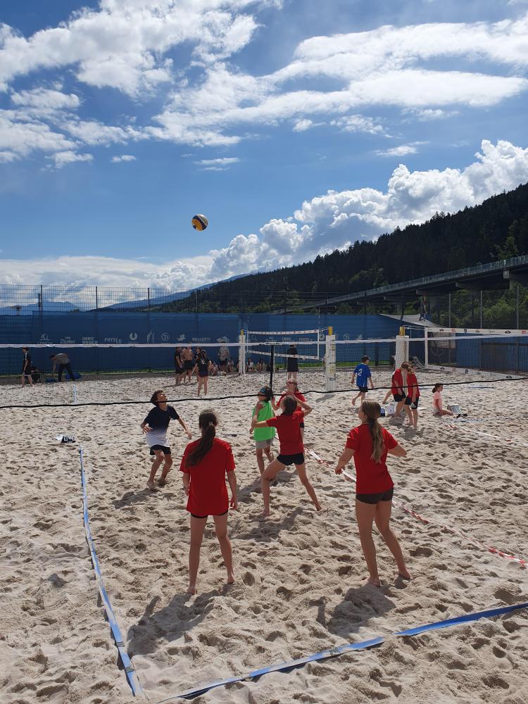 Am 13. Juni fand in Innsbruck das Beachvolleyballturnier der 1. und 2. Klassen Unterstufe statt. 38 Teams aus Tirol nahmen am Bewerb teil. Ein Team setzte sich aus 2 Spieler:innen zusammen. Eine Vielzahl motivierter Kids und eine entspannte Atmosphäre machten dieses Turnier zu einem besonderen Erlebnis, aber auch aufgrund der herausragenden Leistungen unserer drei Teams wird es nun unvergesslich: Lennie Pendl und Ted Naglich gewannen den Bewerb und kürten sich zum Landesmeister, Bella Jöchl und Marie Kröll belegten den starken 4. Platz, ihnen folgten knapp Clara Pinkelnig und Josephina Prem auf Platz 5.