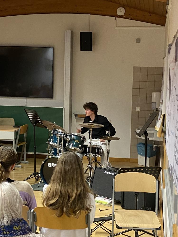 Zu den Highlights des heurigen Jahres zählte der selbst komponierte Song „Rollercoaster“ des Wahlpflichtfaches der Klasse 7d, den die Gruppe im Herbst sogar im Tonstudio aufnehmen durfte. Ein weiterer Höhepunkt war ein Beitrag der Klasse 6d, die live auf der Bühne mit der zuvor in einem Workshop erlernten Technik „Vocal Painting“ improvisierten. Emotional wurde die Verabschiedung der Klasse 8d, die mit einem Bodypercussionstück, das sie bei den musikalischen Kennenlerntagen vor vier Jahren gelernt hatten, ihre Entwicklung zeigten. Auch die Klasse 5d zeigte bereits eine große Vielfalt an musikalischem Können und machte Lust auf weitere Darbietungen in den kommenden Jahren.
